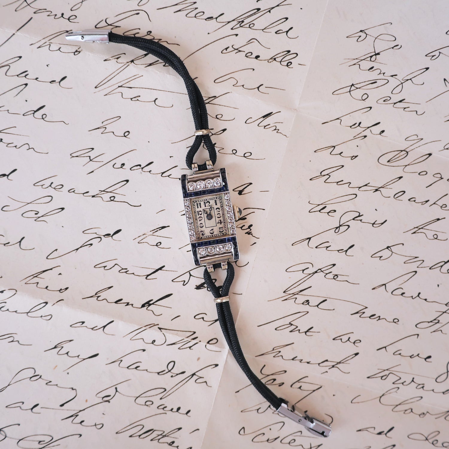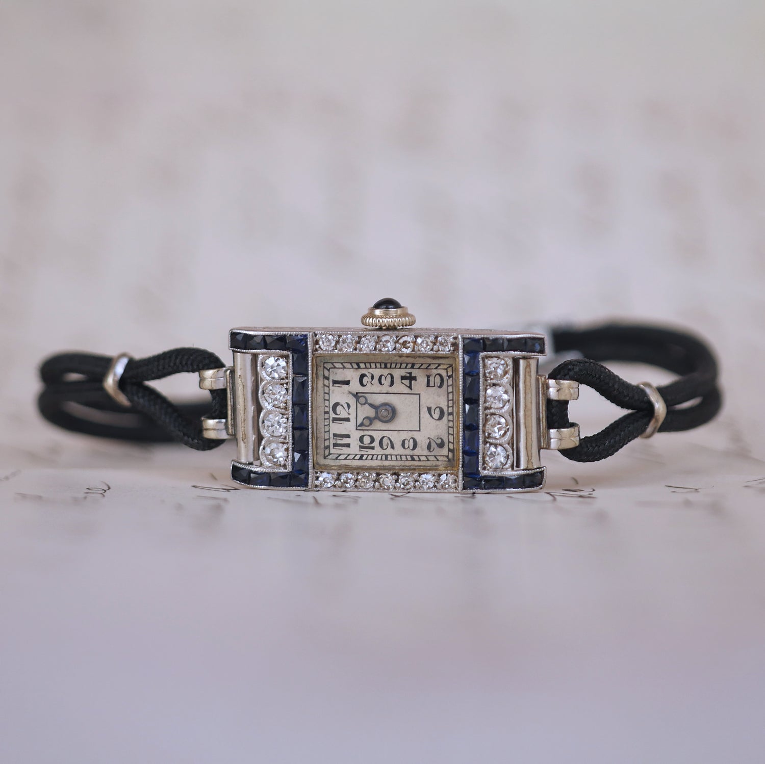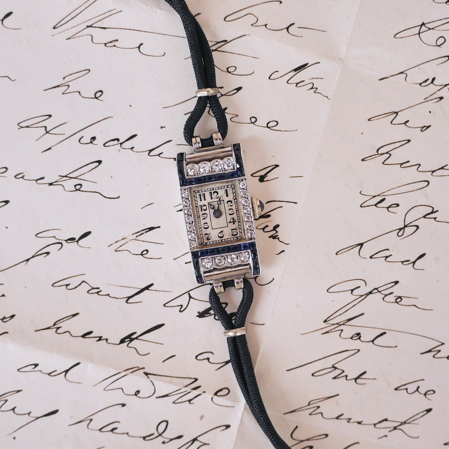 This Art Deco era watch features twenty-two round single cut diamonds weighing approx. 0.50 ctw graded H-I color and SI clarity, accented by twenty six natural French cut blue sapphires weighing approx 0.50 ctw. Set in Platinum. The strap is black chord and 5.25 inches long. Albert Burger signed Swiss movement with Swiss assay marks inside case, sapphire crown, and steel blue hands. Movement not running. Will come with an independent appraisal. Art Deco, Circa 1930.