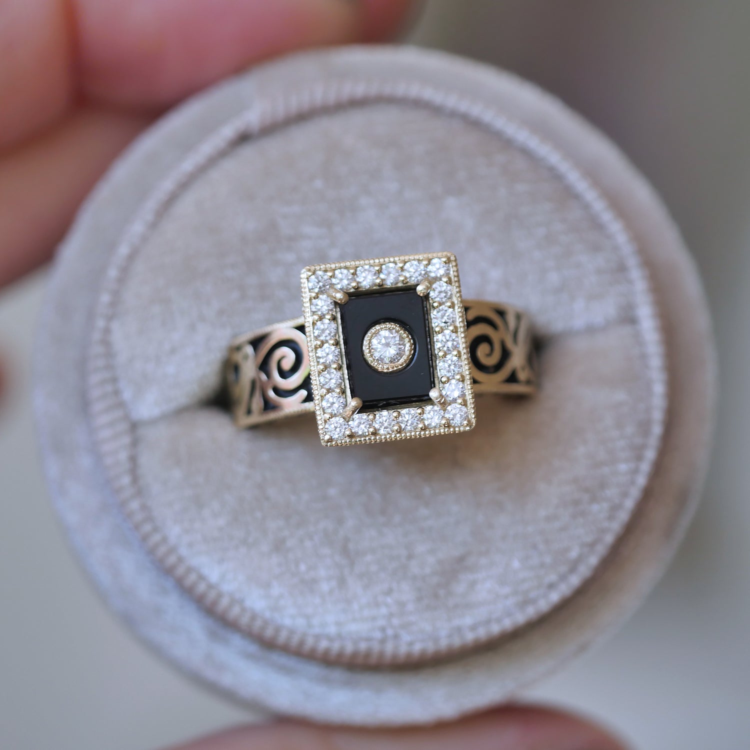 Custom Onyx and Diamond Filigree Engagement Ring