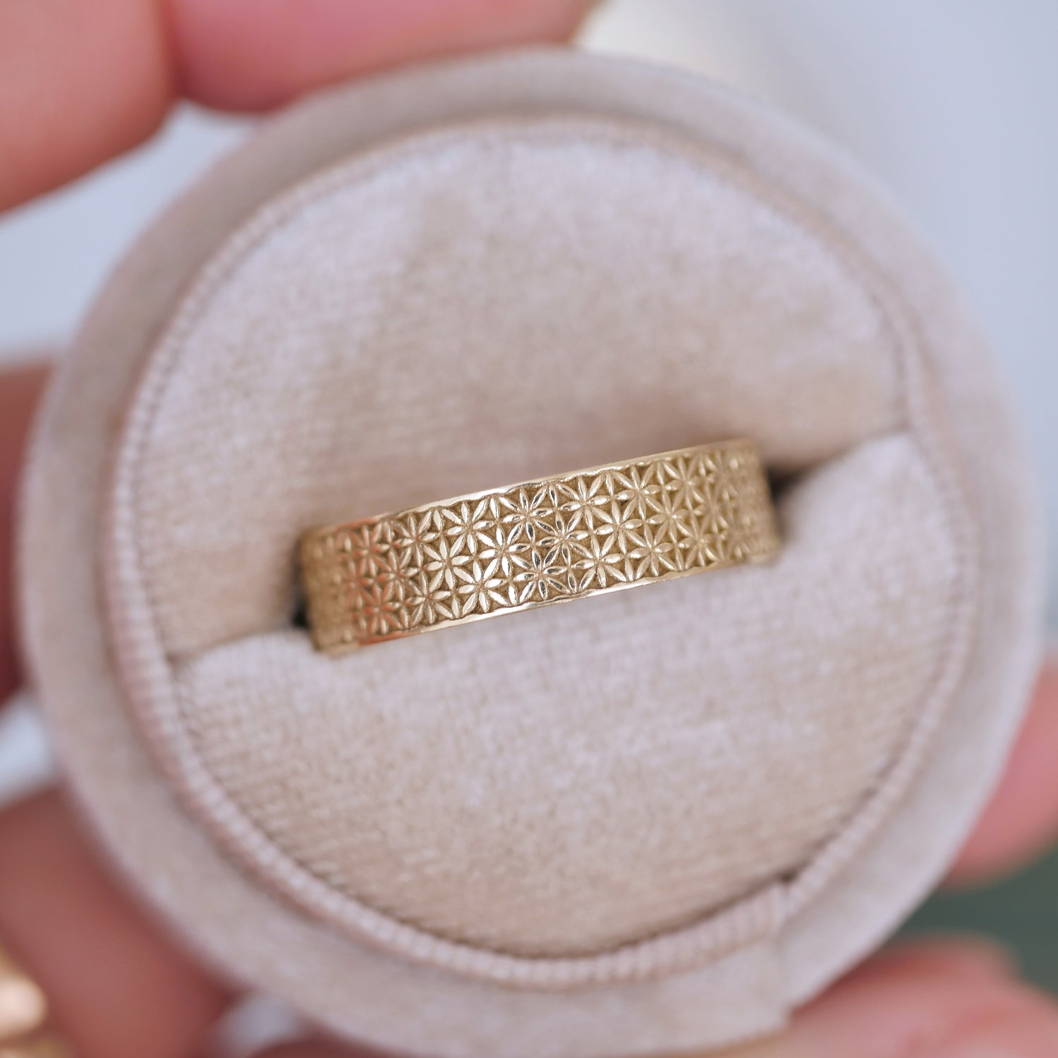 Band Detail: Flat, Antique Star Engraving, Comfort Fit interior